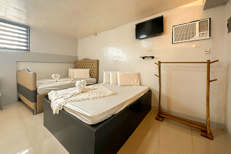 Room with 2 Double Beds and 1 Sofa Bed.Good for 4 adults and 2 kids below 4 years old.Room size: 25 sqm.Air-conditioned roomFlat screen TVHot Shower.In-room Wi-fi.Private Toilet and Bath.Bath Towels.Basic Toiletries: Shampoo, body soap, toothbrush, and toothpaste....