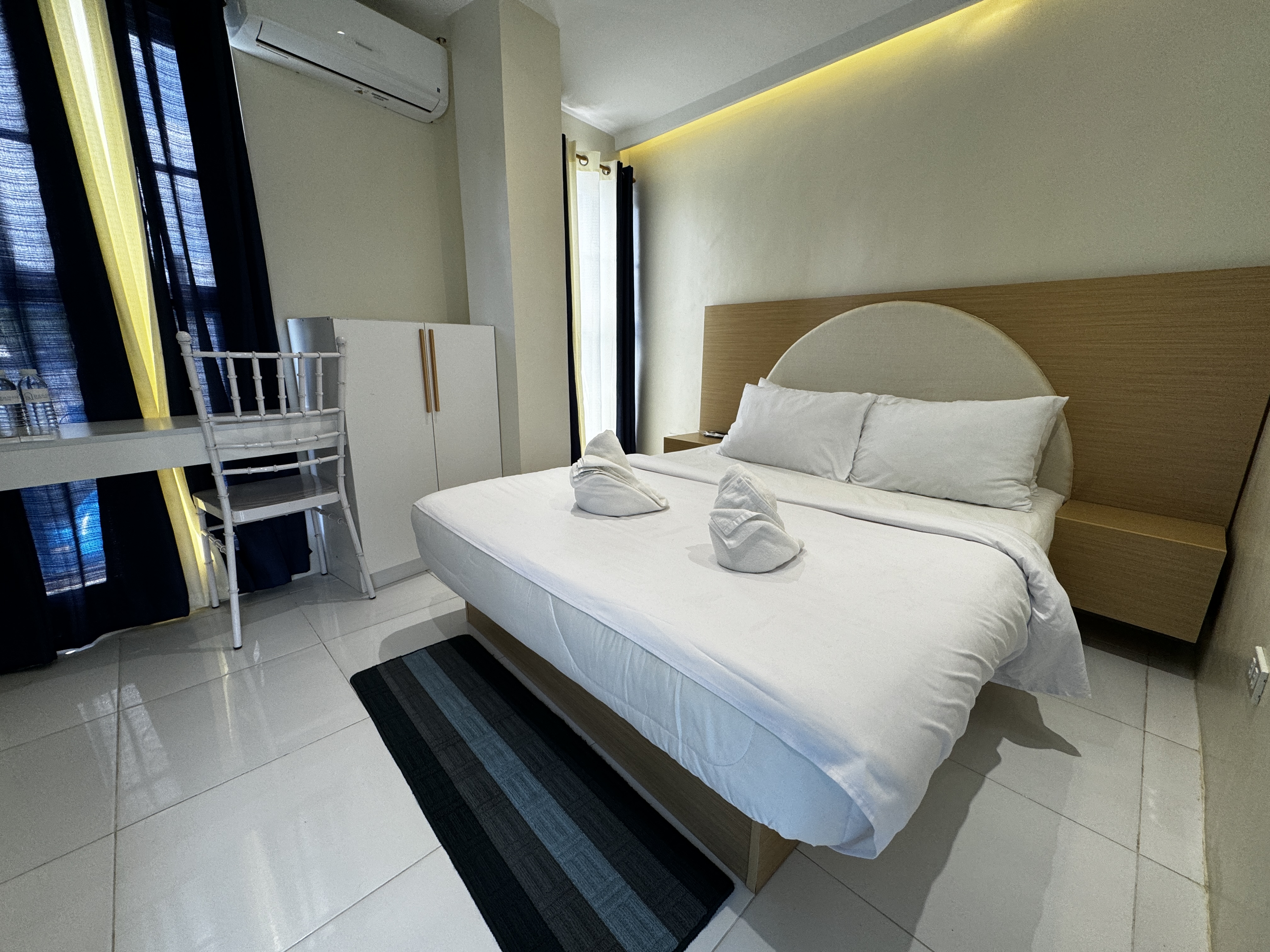 Room with 1 Queen-sized bed.Good for 2 adults and 1 kid below 3 years old.Extra person allowed: 1 adult.Room size: 25 sqm.Air-conditioned room.In-room Wi-fi.Private Toilet and Bath.Hot and Cold Shower.Bath Towels.Basic Toiletries: Shampoo, body soap....