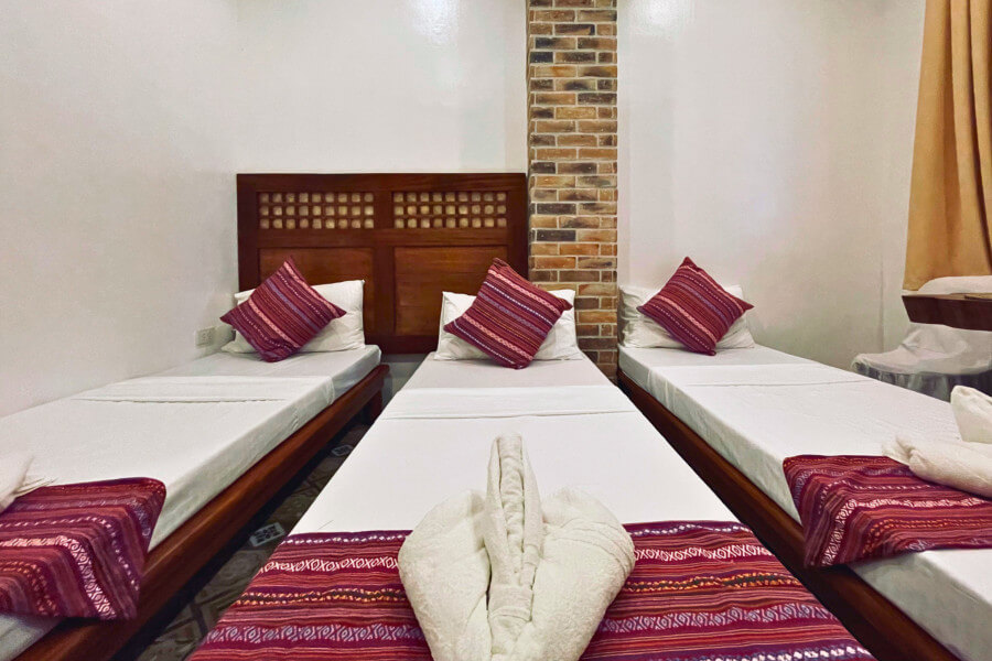 Room with 3 Single Beds.Room size 18 sqm.Good for 3 adults and 1 kid below 5 y/o Free of Charge1 Extra pax ONLY Php 500 (Single sized mattress)3rd FloorAir-conditioned room.Private bathroom.Hot and cold shower.Bath Towels.Basic Toiletries: Shampoo, body soap....