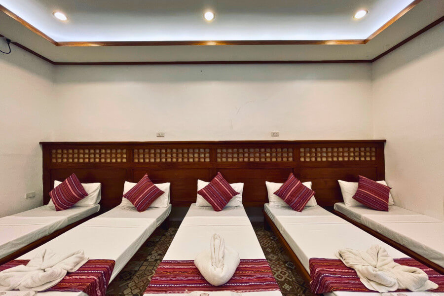 Room with 5 Single Beds.Room size 30 sqmGood for 5 adults and 1 kid below 5 y/o Free of charge5 Adults ONLY3rd FloorAir-conditioned room.Private bathroom.Hot and cold shower.Bath Towels.Basic Toiletries: Shampoo, body soap....