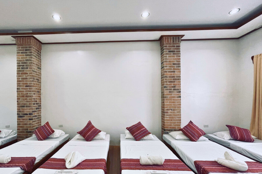 Room with 7 Single Beds.Room size 40 sqmGood for 7 adults and 1 kid below 5 y/o Free of charge1 Extra pax ONLY Php 500 (Single sized mattress)3rd FloorAir-conditioned room.Private bathroom.Hot and cold shower.Bath Towels.Basic Toiletries: Shampoo, body soap....