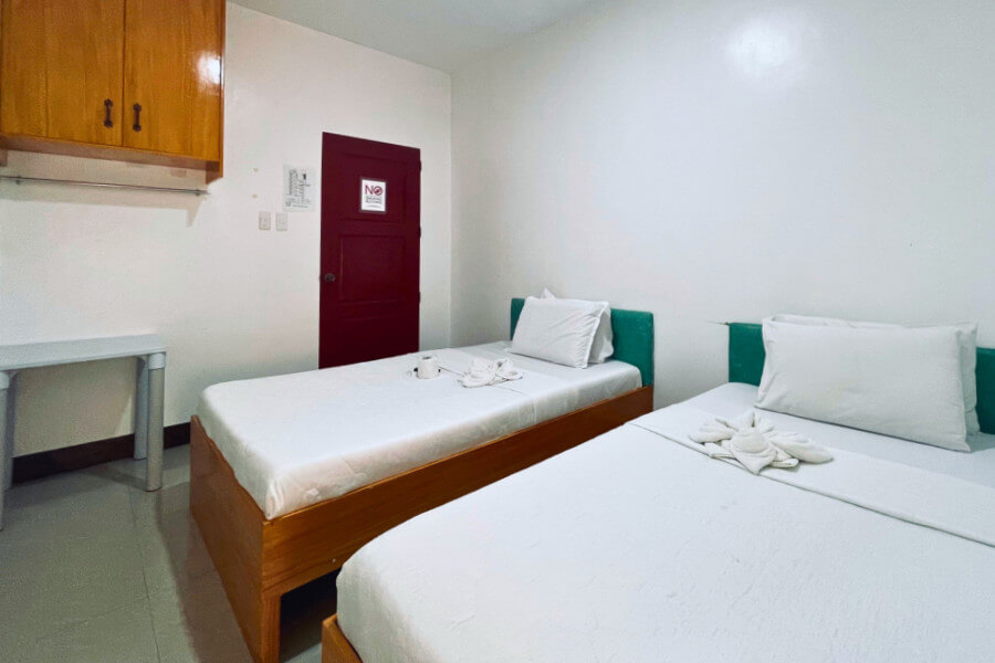 Room with 2 Single Size Bed.Good for 2 adults and 1 kid below 5 years old.Room size: 18 sqm.Air-conditioned room.Private bathroom.Bath Towels.Basic Toiletries: Shampoo, body soap....