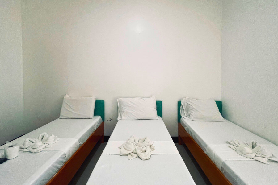 Room with 3 Single Size Bed.Good for 3 adults and 1 kid below 5 years old.Room size: 18 sqm.Air-conditioned room.Private bathroom.Bath Towels.Basic Toiletries: Shampoo, body soap....