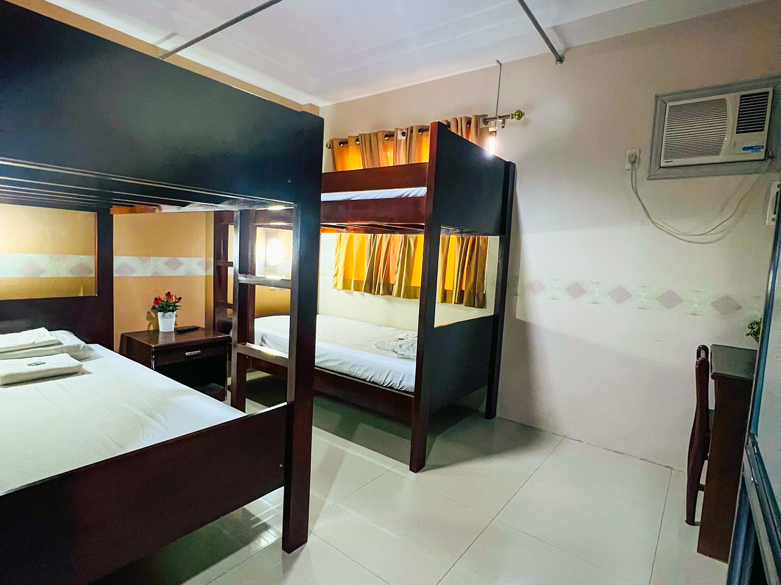 Room with 2 Bunkbeds.Good for 4 adults and 1 kid below 3 years old.Extra pax: Php 500Extra MATTRESS ONLYRoom size: 15 sqm.Room location: ground & second floor.Air-conditioned room.Private bathroom....