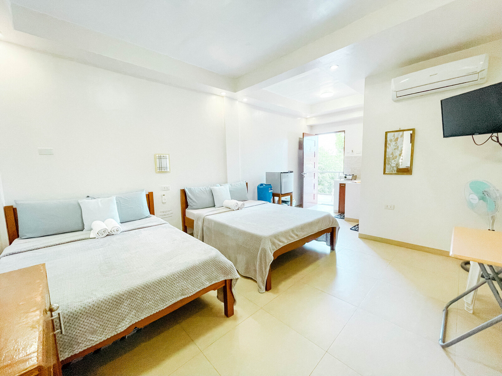 Room with 2 Double Beds.Good for 4 adults and 1 kid below 6 years old.Room size: 24 sqm.Room location: Third FloorAir-conditioned room.Television.Private bathroom.Hot & cold shower. Basic Toiletries & Towels.Kitchen with basic Utensils.Tables & Chairs....