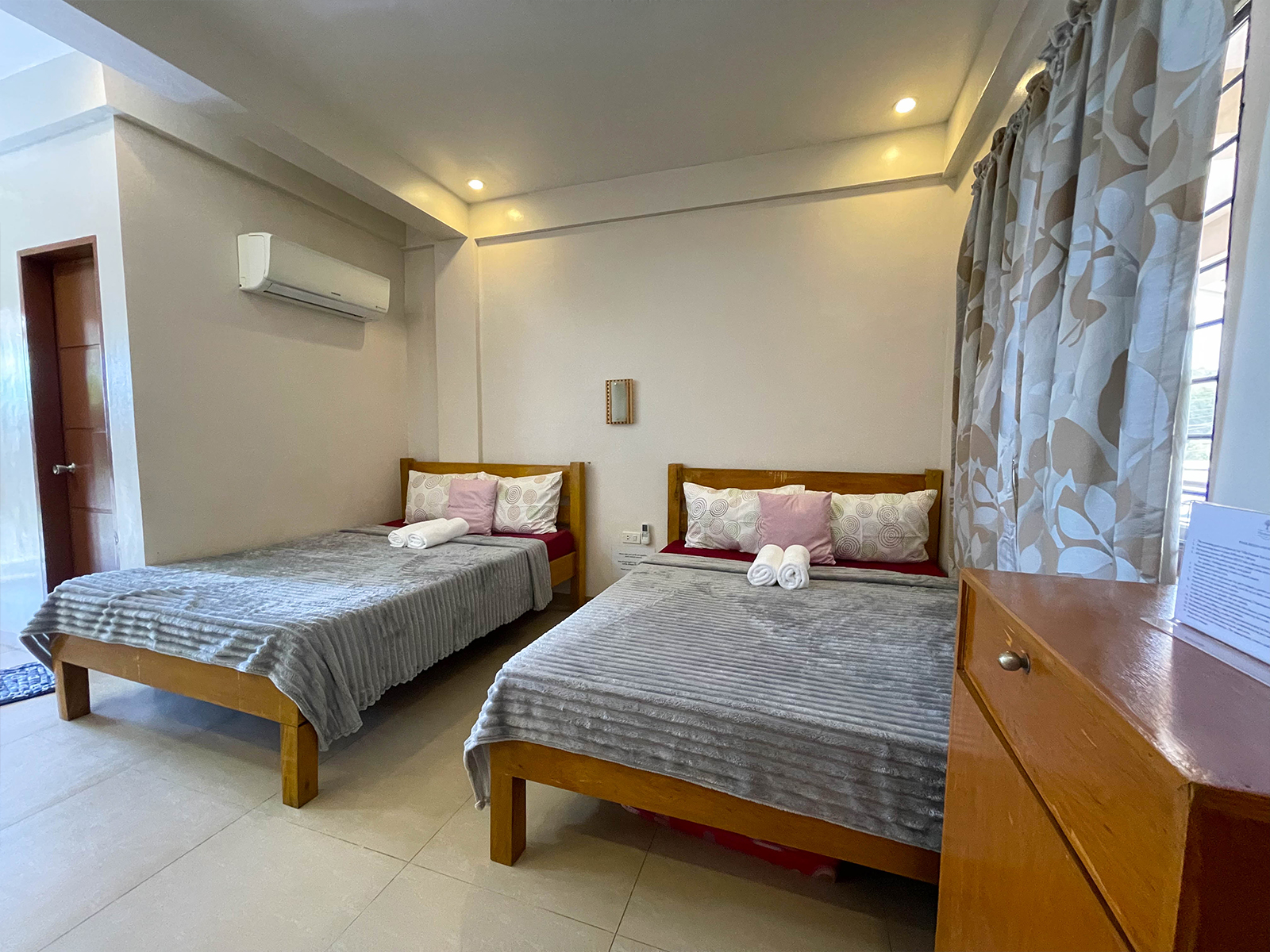 Room with 2 Double Beds.Good for 4 adults and 1 kid below 6 years old.Room size: 24 sqm.Room location: Second floorAir-conditioned room.Television.Private bathroom.Hot & cold shower. Basic Toiletries & Towels.Kitchen with basic Utensils.Tables & Chairs....