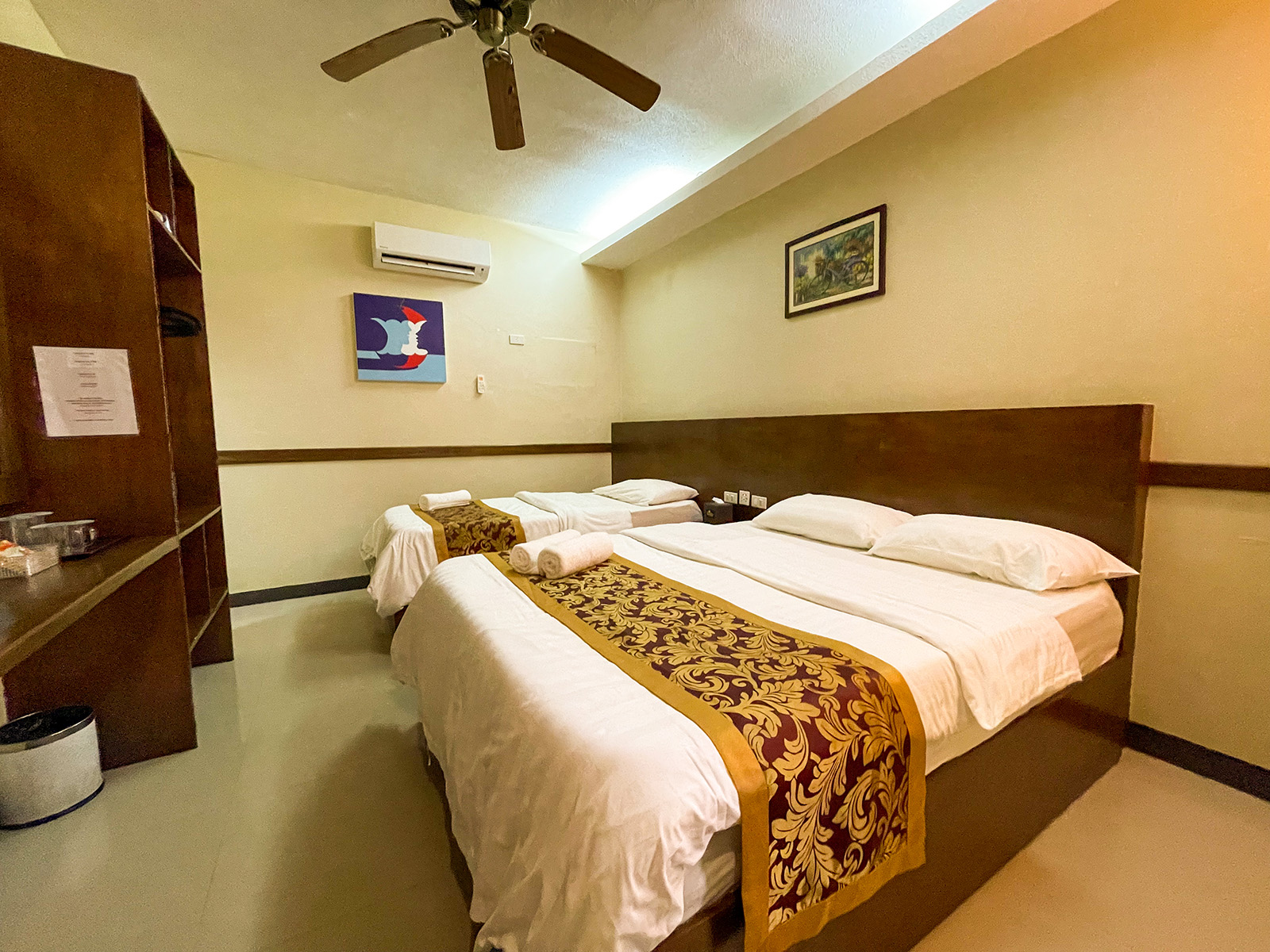 Room with 1 Queen Bed & 1 Single Bed.w/BreakfastGood for 3 adults and 1 kid below 6 years old.Room size: 15 sqm.Room location: 1st-3rd floorAir-conditioned room.Television.Private bathroom.Hot & cold shower. Basic Toiletries.Free bottled water.Towels.Coffee & Kettle....